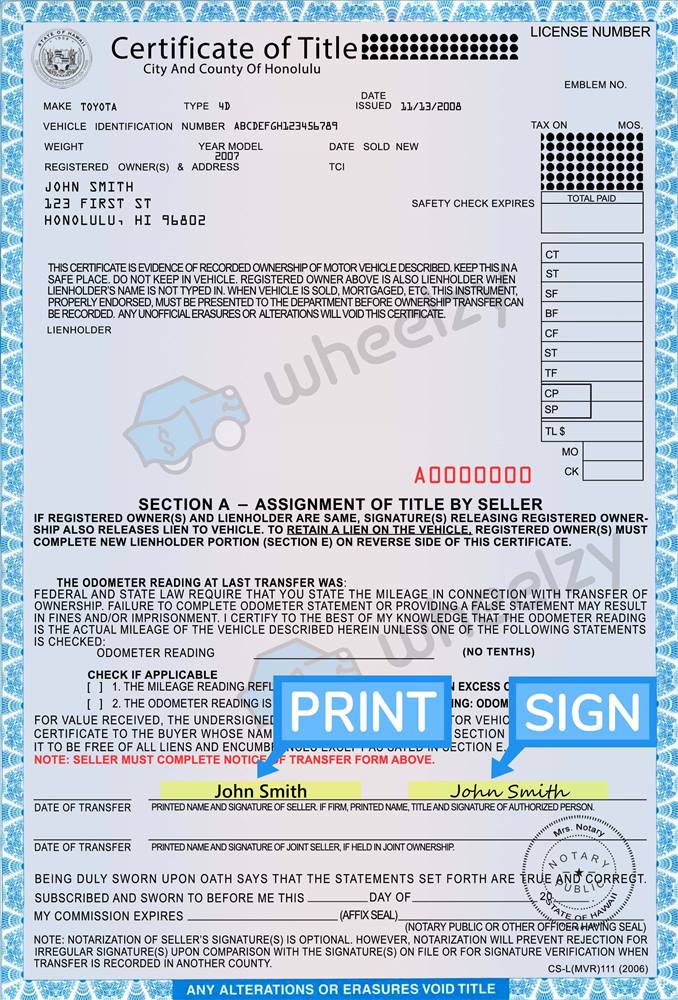 How to Sign Your Car Title in Honolulu. Including DMV Title Sample Picture