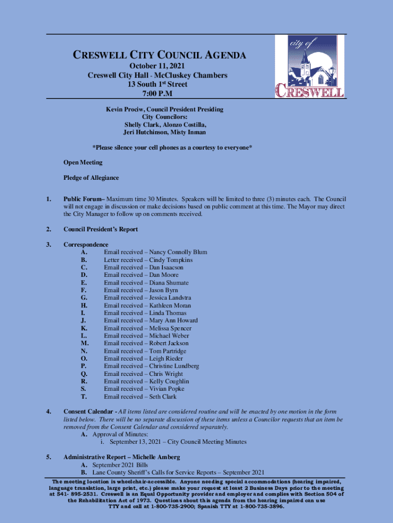 Fillable Online CRESWELL CITY COUNCIL AGENDA City of Creswell Fax