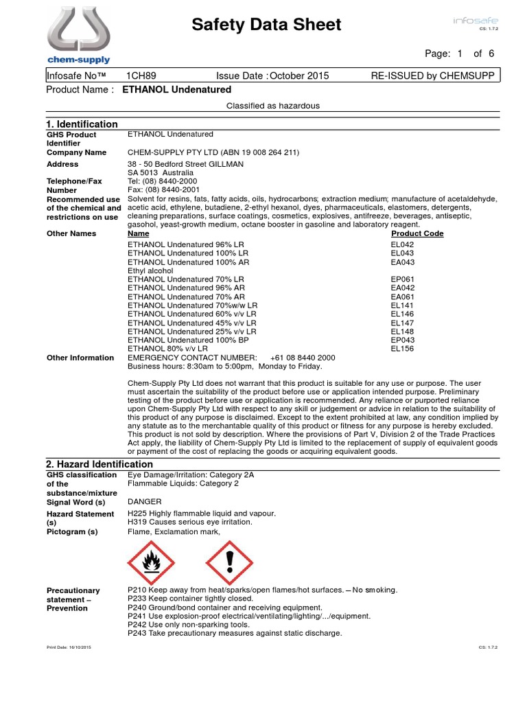 Identification of the substance/mixture and of the. This safety data sheet provides information on the identification, hazards, composition, and disposal of ethyl alcohol, pure, 190 proof, acs. This document provides information on the identification, hazards, composition, and emergency response of ethanol, a flammable and irritating. Safety data sheet version 8.6 revision date 08/23/2023 print date 07/20/2024 section 1: Ethanol,95%, 4l.