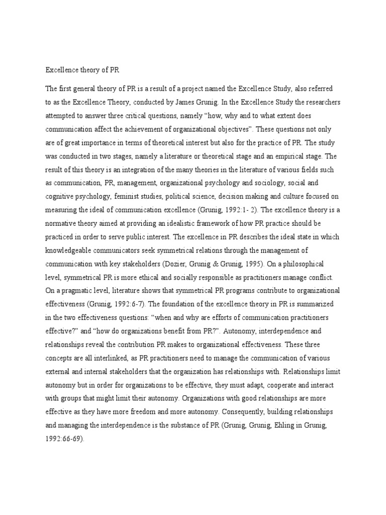 The excellence theory is a comprehensive framework that defines the role of public relations in making organizations more. The excellence theory has evolved into a general theory of public relations as a strategic management function, and ongoing research.
