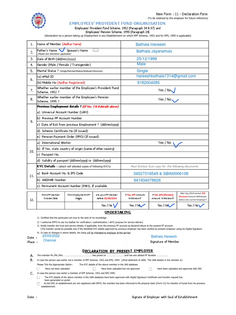 Employees' Provident Fund Organisation New Form 11 Declaration Form