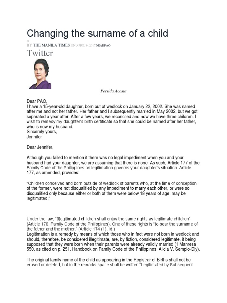 Changing The Surname of A Child PDF Birth Certificate Legitimacy