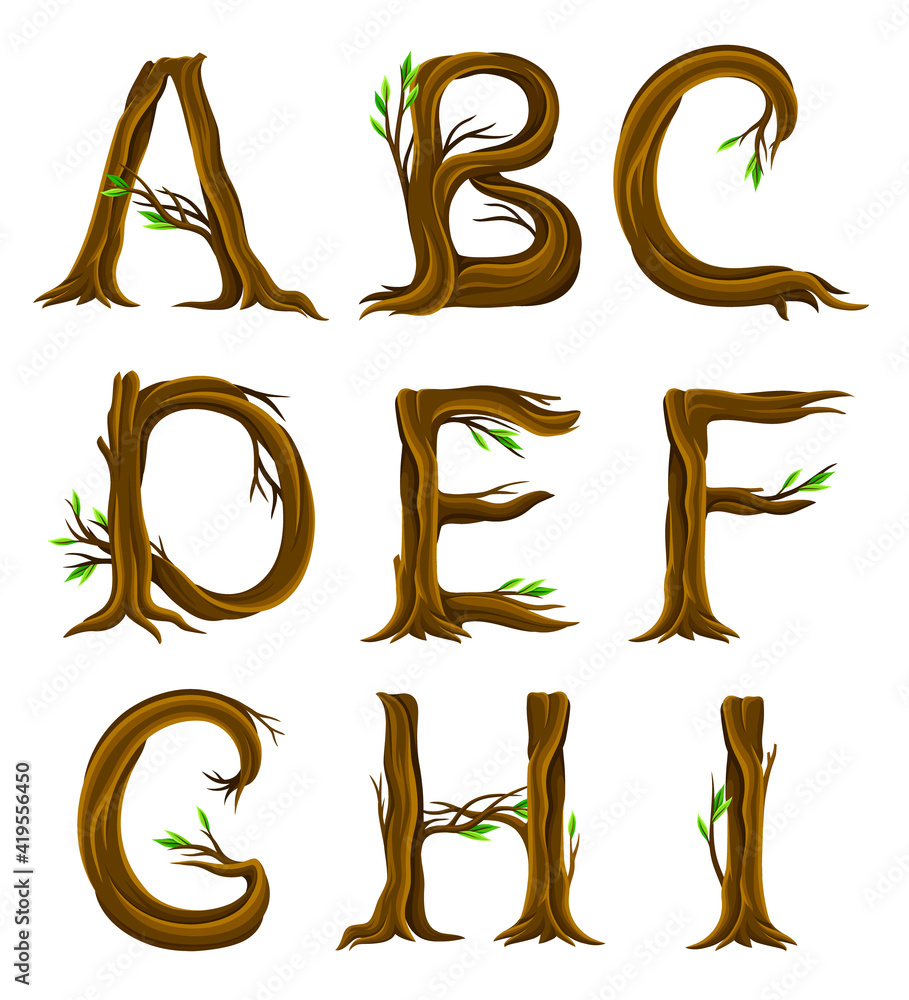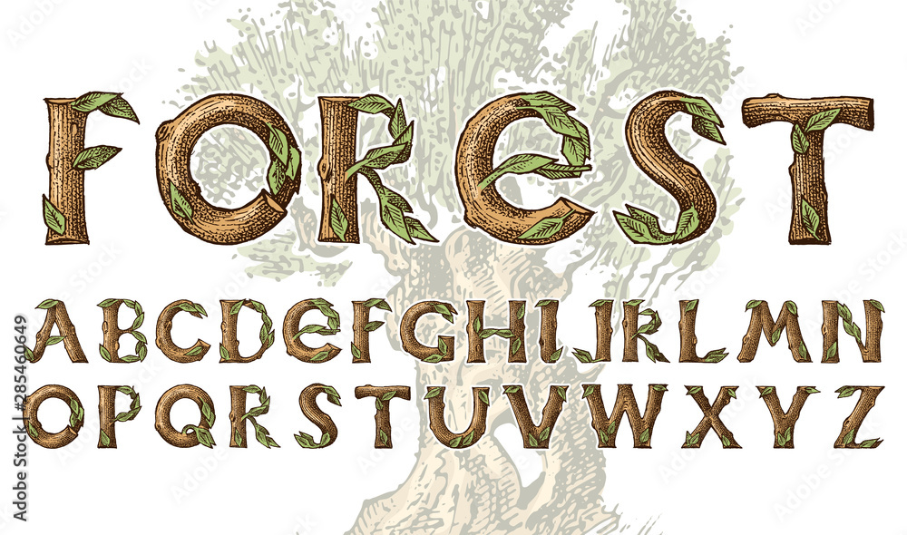 Antique wood Font for forest posters. Decorative ancient alphabet