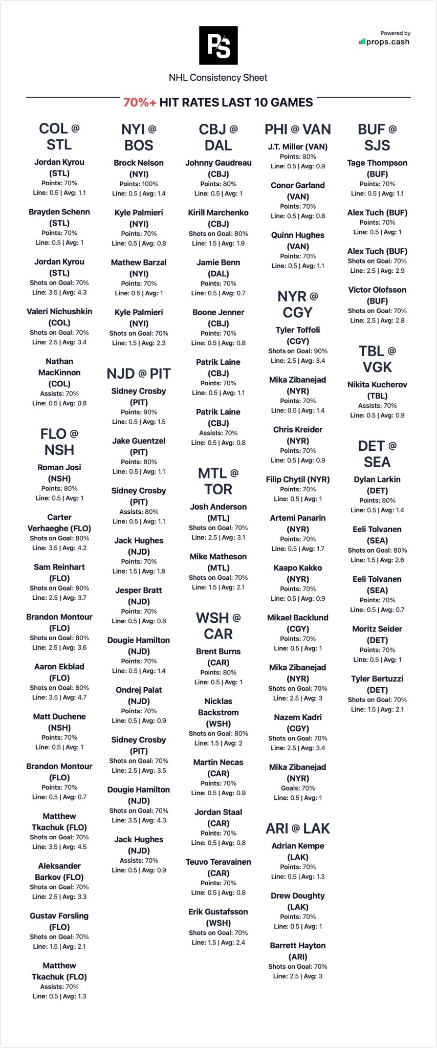 Nhl Consistency Sheet - We scan thousands of data points, betting odds,. You can effortlessly select a player prop of interest and. Nhl consistency sheet (2/21/2023) today's sheet includes 30 props and 26 players. The betprep player prop cheat sheet is the fastest way to find the best prop bets for the day’s action. 51 rows to further emphasize consistency, simply divide that average variance by the player's points per game. The edge nhl cheat sheet ingests enormous amounts of data. Each prop on this sheet has hit in at least 8 of. Then it runs its proprietary algorithms to identify only the nhl prop bets. Consistency sheets serve as comprehensive form guides for player prop betting.