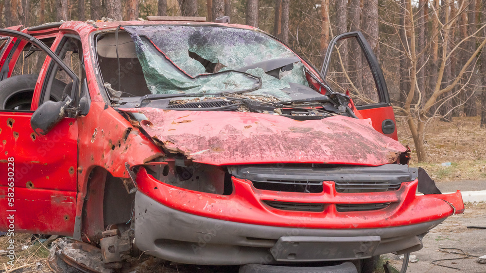 Rusty and broken red abandoned car on the city street. Abandoned old