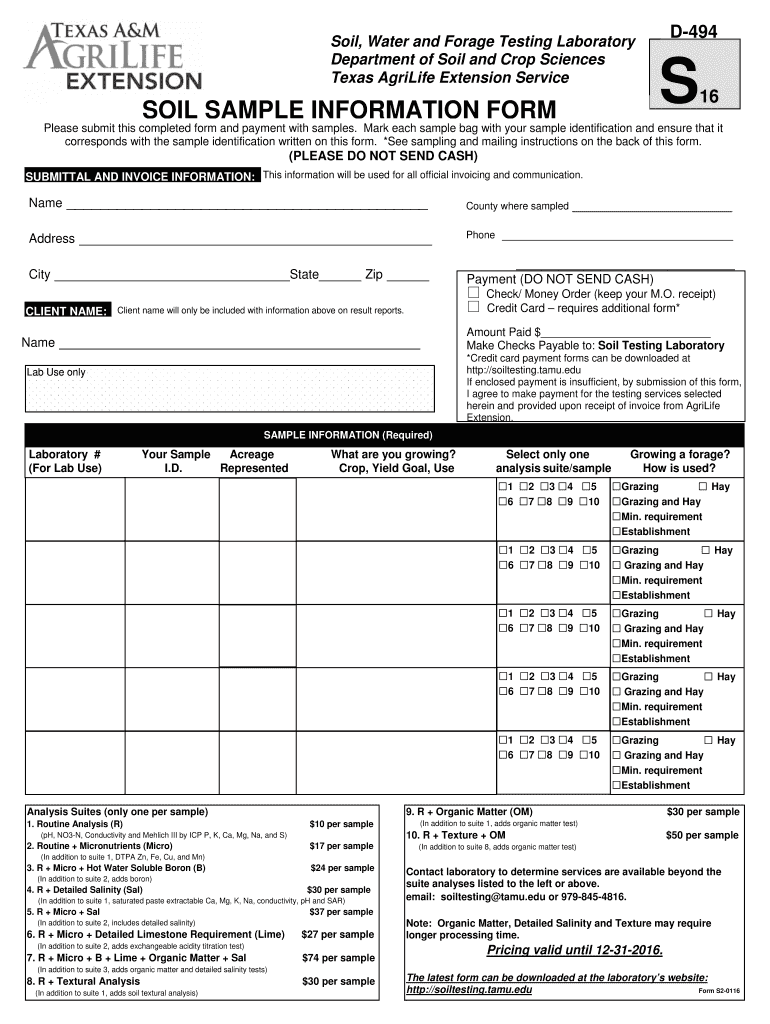 Fillable Online SOIL SAMPLE INFORMATION FORM Texas AM AgriLife Fax
